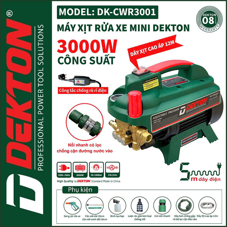 Phân phối máy xịt rửa áp lực cao 220V 3000W 180bar 14L Dekton DK-CWR3001 tự động có chỉnh áp. Sử dụng vệ sinh máy lạnh, rửa xe máy ô tô gia đình, vệ sinh nhà hàng, xịt rửa sàn nhà, xịt rửa nhà cửa, vệ sinh vật dụng dụng cụ, phun xịt rửa máy móc thiết bị công nghiệp, phun xịt tưới cây nông nghiệp, phun xịt rửa chuồng trại chăn nuôi. Được sản xuất với công nghệ mới được khách hàng đánh giá cao về chất lượng, duy chuyển gọn nhẹ linh hoạt tiện lợi.