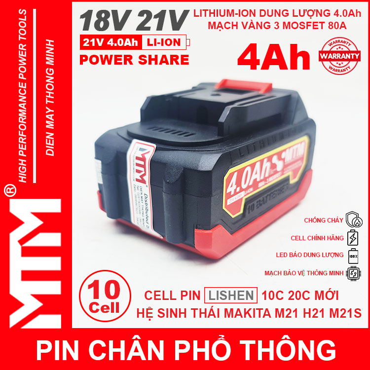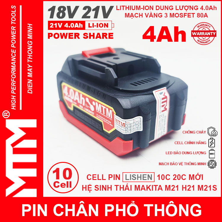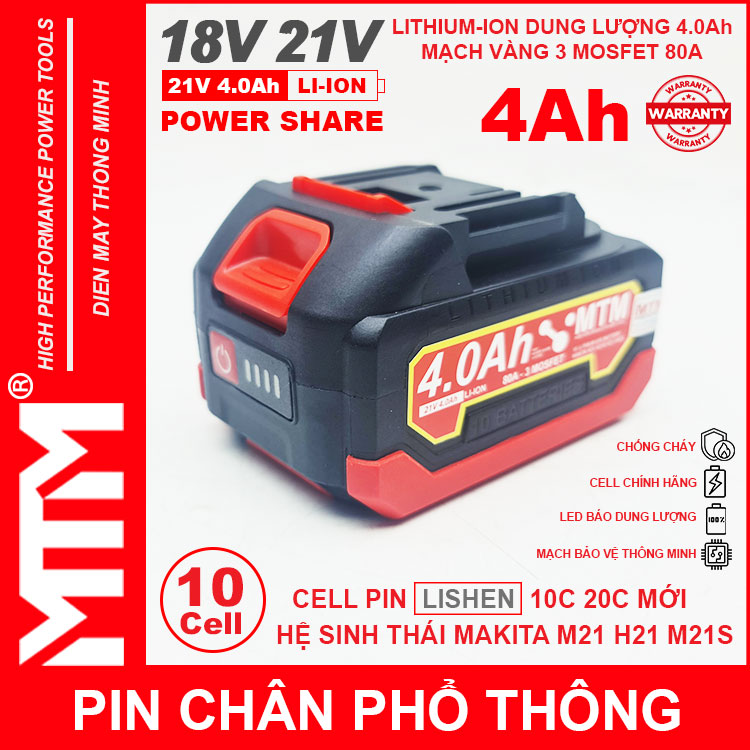 Pin chân phổ thông Makita 18V 21V 4Ah 10cell mạch 80A led báo pin chống sốc cell LISHEN. Sử dụng cell Lithium-ion 18650 10C 20A LISHEN chính hãng chuyên dụng cho các thiết bị cầm tay chịu tải lớn dòng xả cao như bắn vịt, bắn bulong, máy khoan đục bê tông, máy mài, đèn, quạt dùng pin, máy thổi hút bụi và nhiều thiết bị cầm tay khác.